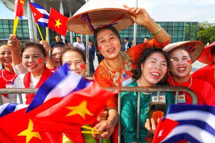 At Noi Bai International Airport, the Head of State was received by Nguyen Xuan Thang, member of the Political Bureau, director of the Ho Chi Minh National Academy of Politics, and president of the Central Theoretical Council, along with other party, government, and Friendship Association officials from both countries. Some 200 people, waving Cuban and Vietnamese flags and welcoming their true friends with joy, were also at the terminal.